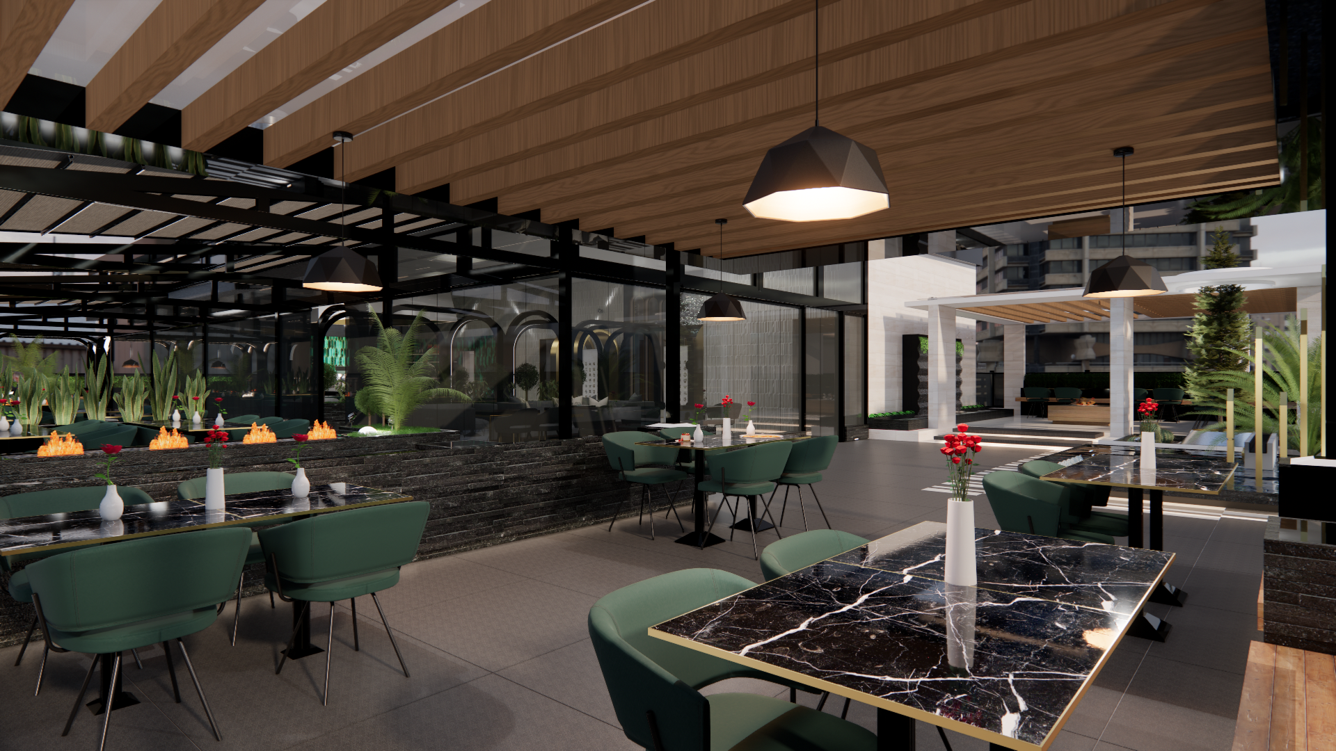 The signature Royal Cabana features a palm tree—symbolizing nourishment, resilience, and the cultural identity of Iraq—rising through the atrium and reaching toward the sky. Linear fire pits divide the space into intimate seating pockets, creating a calm and private atmosphere for guests.