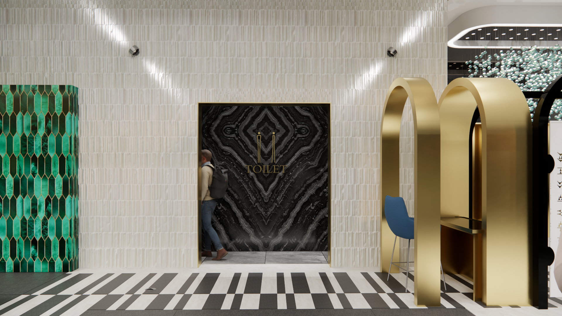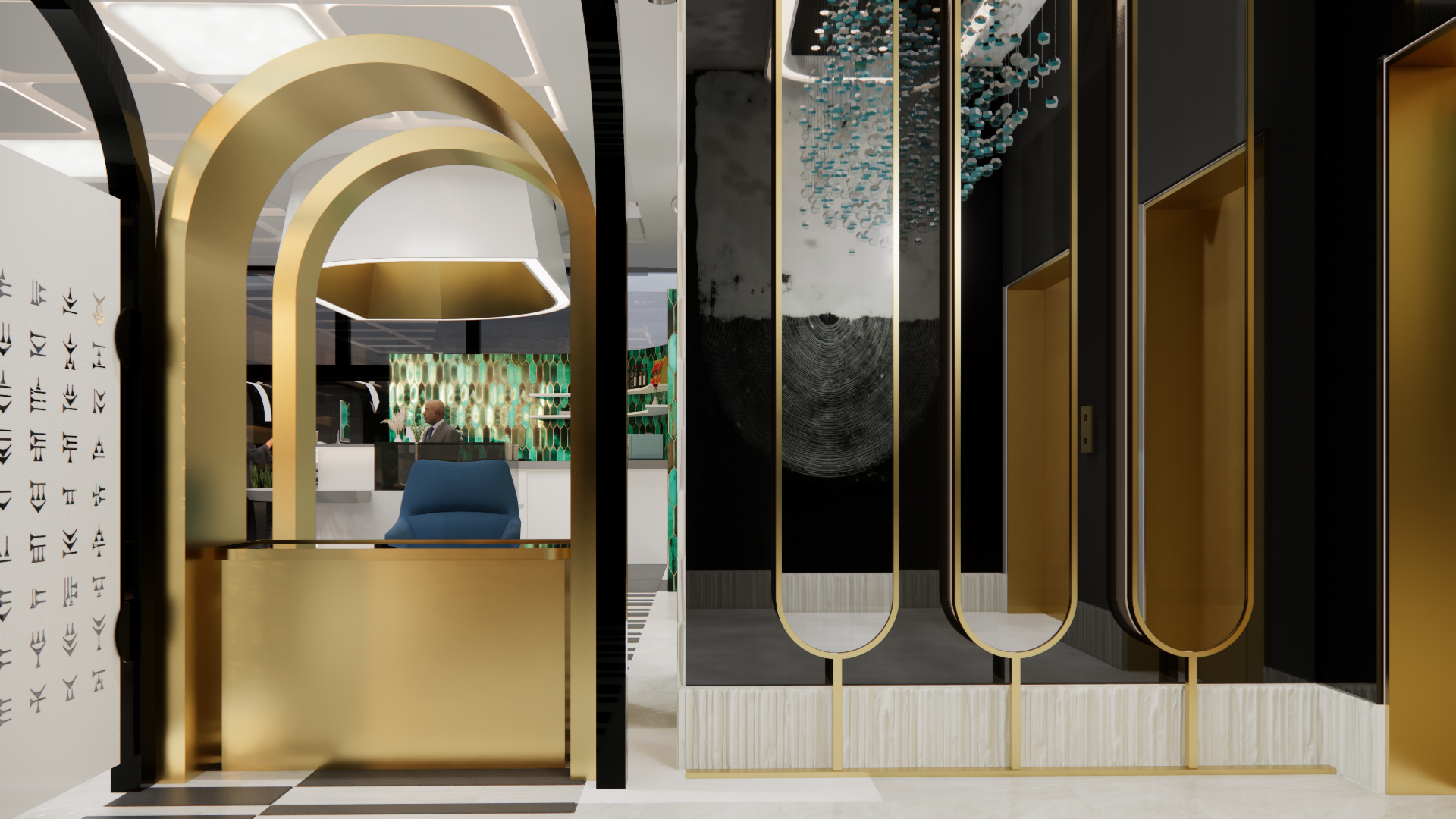 Water elements—reflecting pools and fountains—at the entrance and outdoor areas reference the foundational role of rivers in Sumerian culture and the daily life of its people. A sequence of connected arches at the entrance seamlessly transitions guests from outside to inside, subtly dividing the lounge into public and semi-private zones.